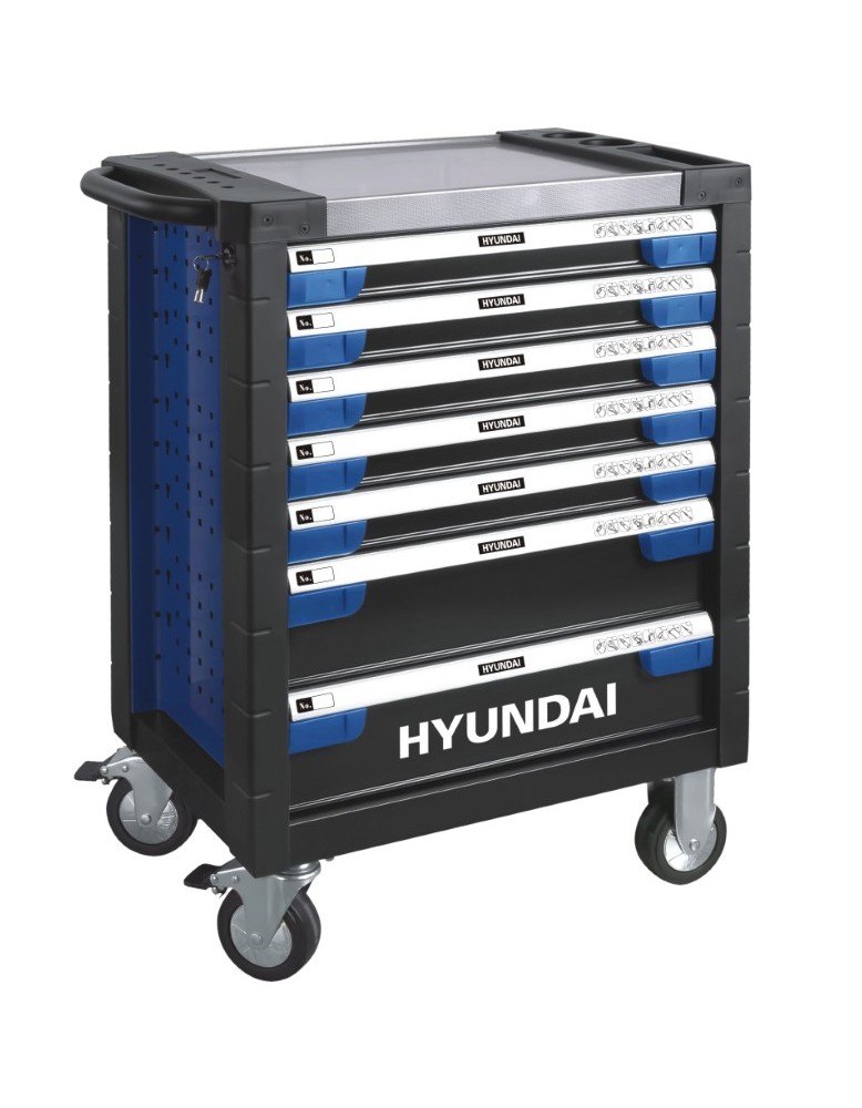 Carrello utensili Hyundai 305 elementi(302 pezzi + 3 accessori) – 6 cassetti + 1 – vassoi in spugna – piano superiore in acciaio inox – cassetti con chiusura a chiave e scorrimento con cuscinetti a sfera